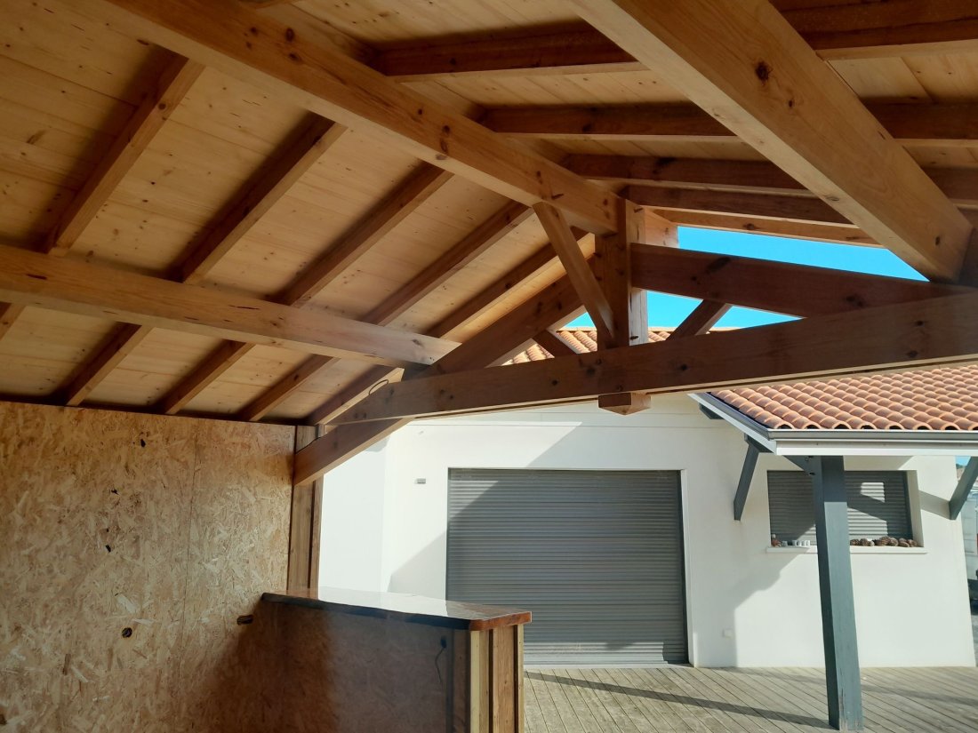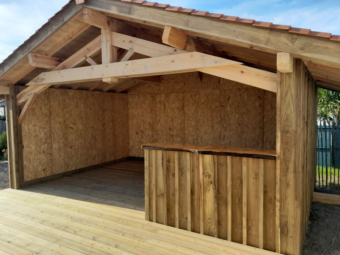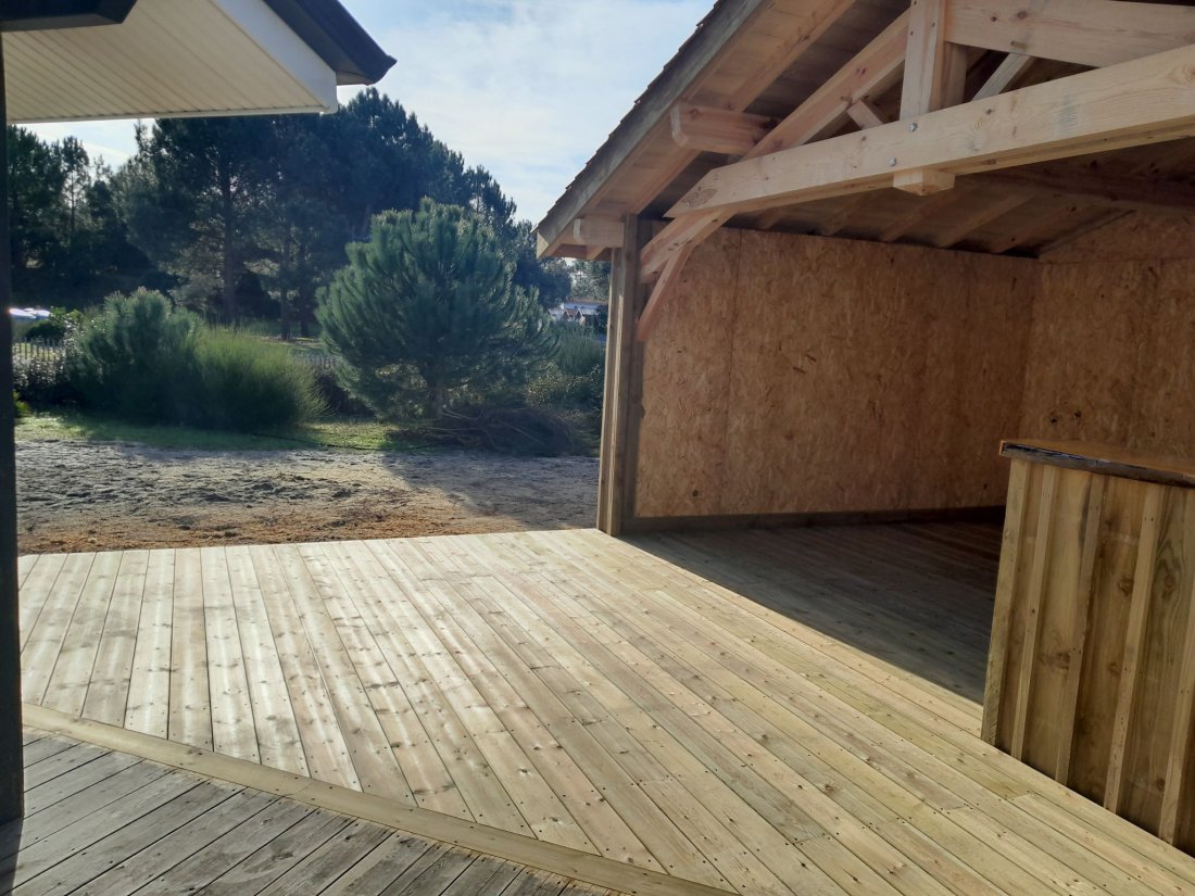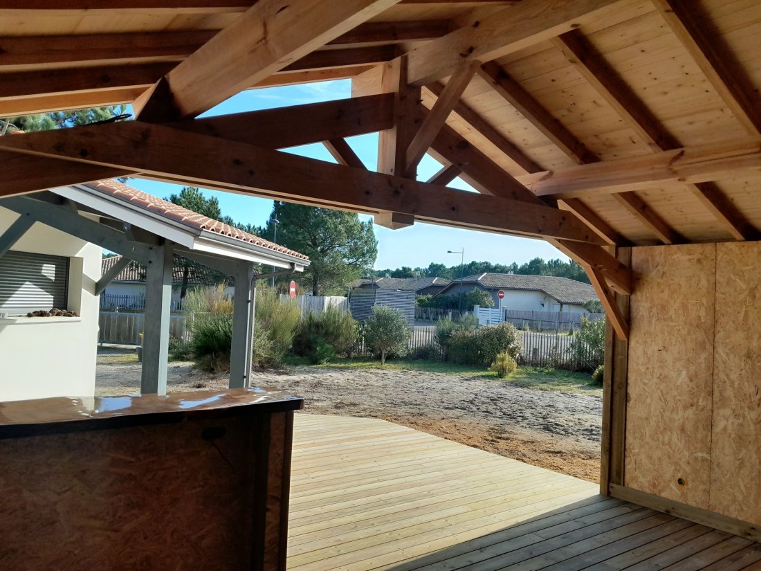 A Mimizan Plage, DECK40 a construit cette cuisine d'été en ossature bois, charpente traditionnelle 2 pans avec couverture en tuiles et bardage de type traditionnel en Douglas de France