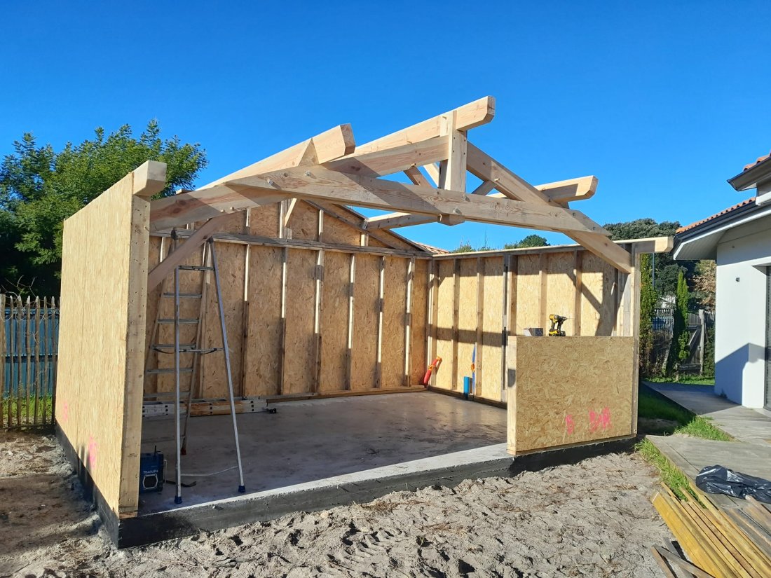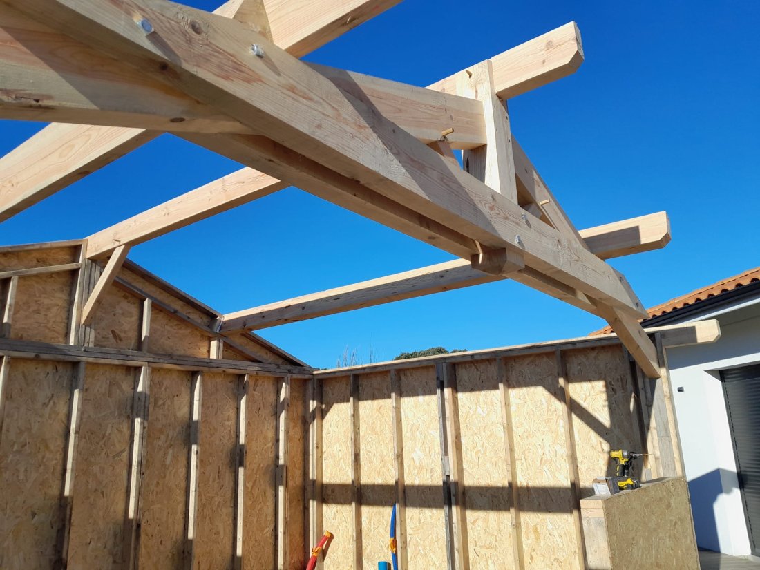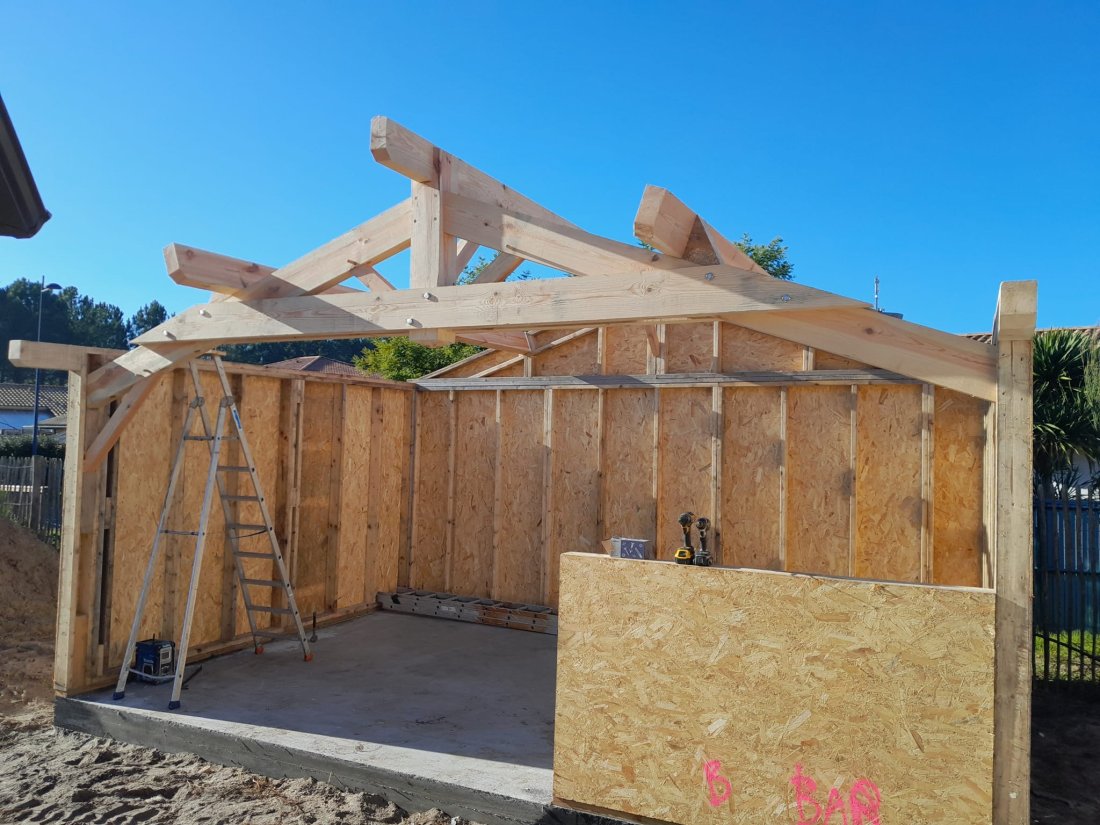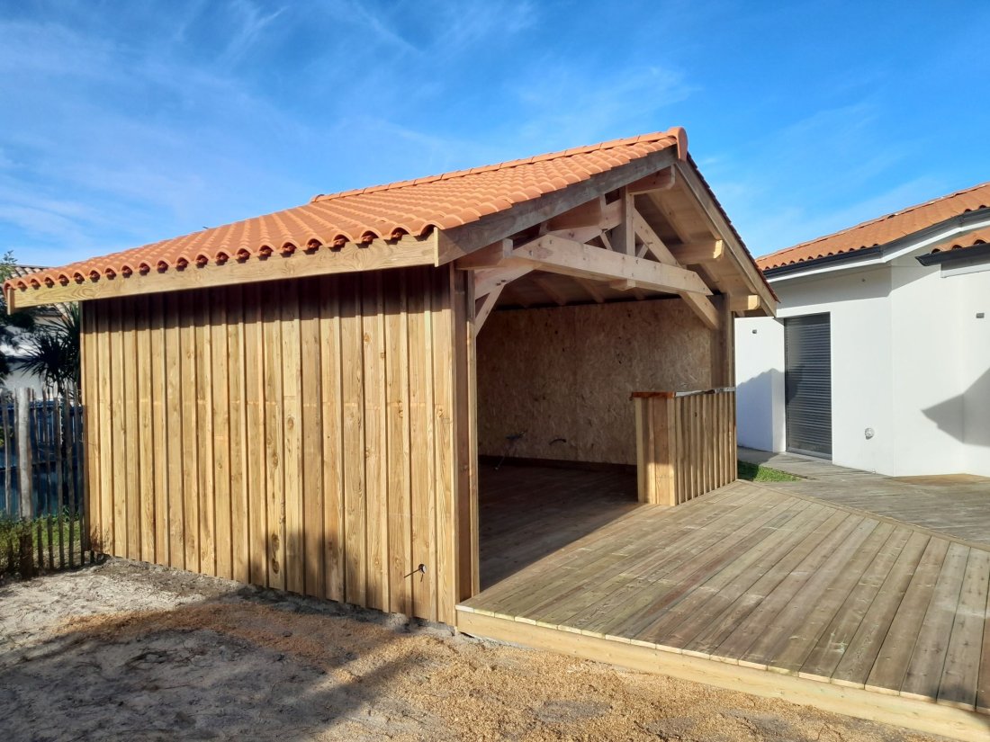 A Mimizan Plage, DECK40 a construit cette cuisine d'été en ossature bois, charpente traditionnelle 2 pans avec couverture en tuiles et bardage de type traditionnel en Douglas de France